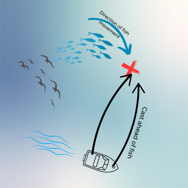 For schooling fish, stay on the periphery and cast ahead to avoid scattering them. For larger fish, focus on areas where birds are swooping or circling.