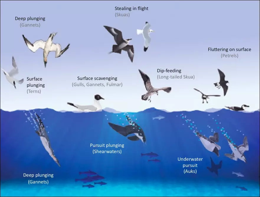 Frigate birds often soar at high altitudes, descending only when spotting potential prey. Boobies and terns, on the other hand, glide closer to the water, making them easier to track when they spot fish.