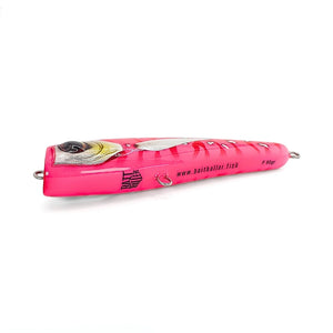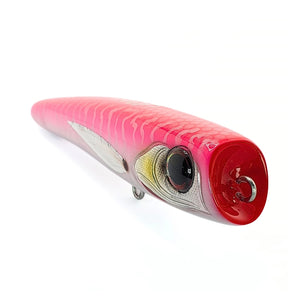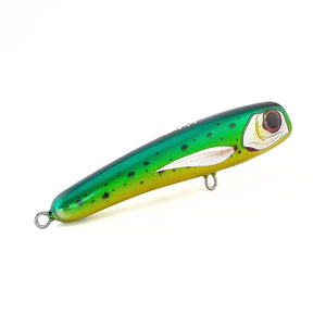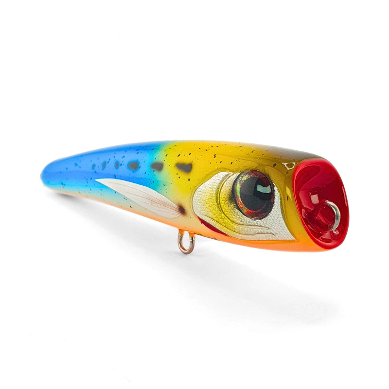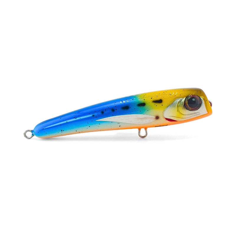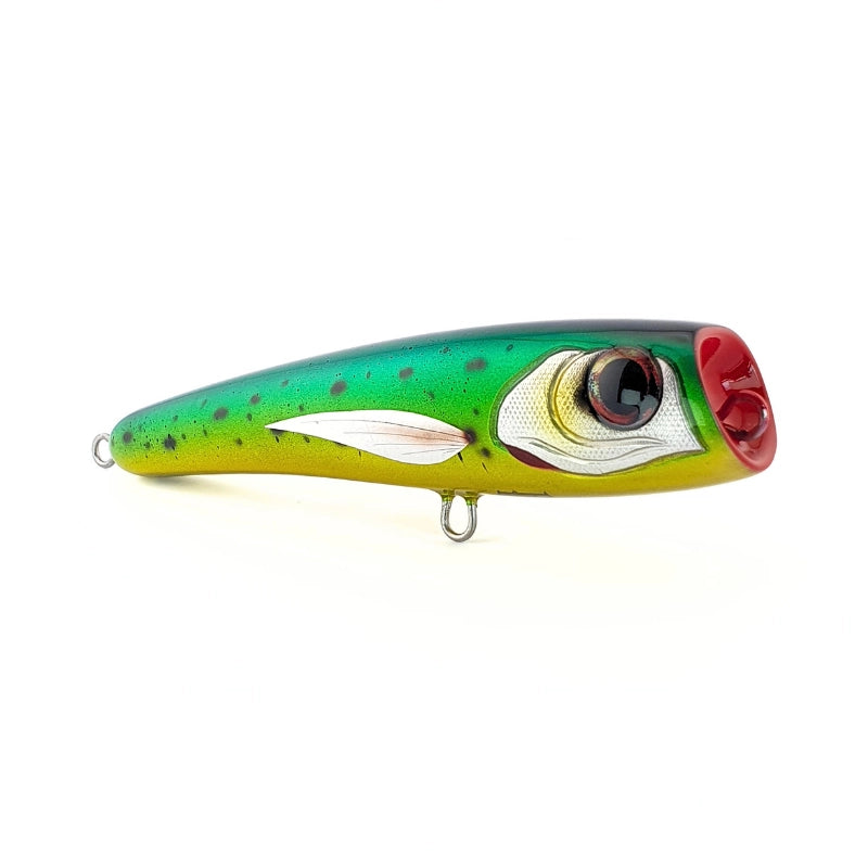 El popper de buceo Dakochan 175P combina una acción suave y sedosa con un pop y un buceo clásicos, alcanzando mayores profundidades para capturar grandes especies de arrecife y gigantes pelágicos como el wahoo, el mahi-mahi y el pargo grande. Su diseño versátil brilla en entornos de roca, surf y alta mar, ofreciendo un potente barrido o una rápida recuperación con una acción similar a la de un stickbait. Fabricado artesanalmente con un alambre pasante de acero inoxidable, es perfecto para pescar desde costas escarpadas o en mar abierto.