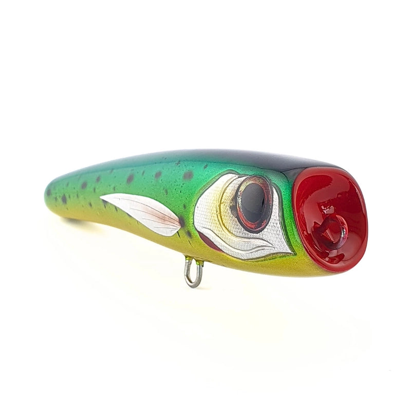 | Action The Dakochan Diving Popper’s exceptionally balanced design affords it a beautiful, natural swim action with a loud pop and slurp on the pull. |
